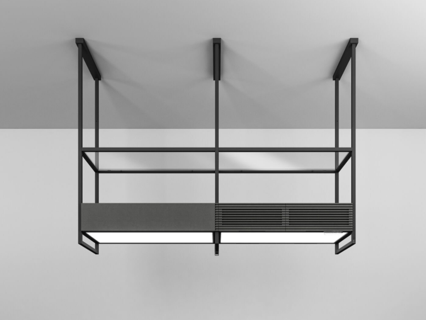 Open Suite nabízí několik funkcí: nejen odsavač par, ale také osvětlení a široký výběr polic. Dodává se se čtyřmi přednastavenými konfiguracemi (ostrůvek 80 cm a 160 cm, montáž na zeď 80 cm a 160 cm), které mohou být samostatným řešením i základem pro individuální řešení pomocí příslušenství. Široký výběr dostupných prvků a povrchových úprav zahrnuje skleněné police (čiré a kouřové), černě lakovanou plnou nebo děrovanou (tahokov) kovovou polici, dřevěnou (přírodní dřevo nebo dekor ořech) polici, ale také odsávací moduly nebo světelné panely pro zvýšení výkonu odsávání nebo rozšíření světelného výkonu napříč pracovní plochy. V ostrůvkové verzi je výška konstrukce nastavitelná, aby umožnila instalaci uvnitř jakéhokoli prostoru, bez ohledu na výšku stropu. Vytvořte si svou vlastní jedinečnou verzi Open Suite s použitím volného prostoru, navazováním linií a geometrií podle svého osobního vkusu a stylu vašeho nábytku.