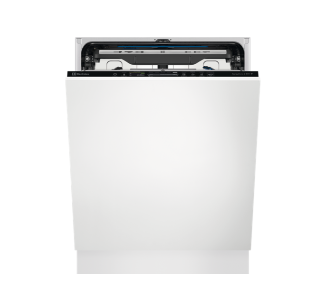 Horní košík má 2 skládací držáky, 2 skládací drátěné držáky pro skleničky, 2 měkké špičky, 6 měkkých špiček pro vinné sklenky, skládací poličky na šálky, Premium Rails, nerezové držadlo Electrolux, Postranní držáky košíku